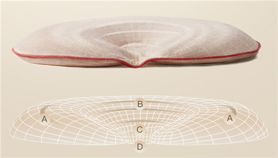 Babycare云朵枕設(shè)計(jì)了四個(gè)功能分區(qū):兩側(cè)睡眠區(qū)(A區(qū)),輔助定型;后腦貼合區(qū)(B區(qū)),引導(dǎo)睡姿;仰睡承托區(qū)(C區(qū)),分散壓力;頸部貼合區(qū)(D區(qū)),保護(hù)頸椎。頸部凹槽區(qū)近0高度,水波紋緩坡設(shè)計(jì),更貼合成長(zhǎng)期的寶寶頸椎曲線,保護(hù)頸椎發(fā)育。